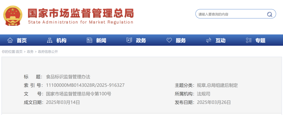 为进一步规范食品标识标注,加强食品标识监督管理,保护消费者合法权益,针对消费者反映强烈的食品生产日期、保质期“找不到、看不清、不易算”等问题,市场监管总局近日制定出台《食品标识监督管理办法》(以下简称《办法》),将与新修订的《食品安全国家标准 预包装食品标签通则》(GB7718—2025)配套同步实施。