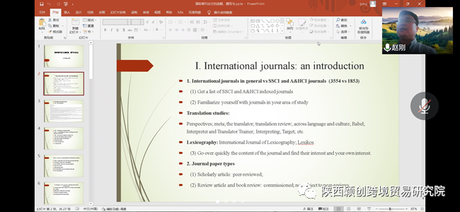 为进一步提升研究人员学术论文写作与发表水平,6月1日下午,陕西颖创跨境贸易研究院语言服务研究所联合西安翻译学院英文学院邀请华东师范大学赵刚教授,为“2022颖创博士论坛”做了题为“国际学术期刊论文的选题、撰写与发表”的学术讲座。本次讲座采用线上线下相结合的方式进行。研究院监事杨妍、语言服务研究所成员和西安翻译学院教师代表在西安翻译学院西区一号楼1212教室参加了此次讲座,会议在腾讯会议同步直播。会议由西安翻译学院英文学院院长王文教授主持。