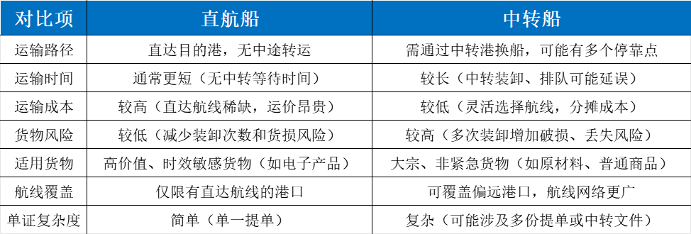 直航船和中转船是国际物流中两种常见的运输方式,主要区别在于运输路径、成本和时效性。以下是它们的核心区别及适用场景:
