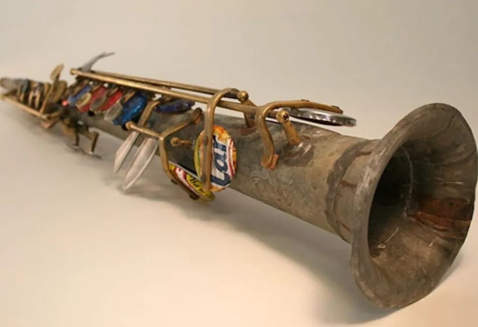 最厉害的是下面这根降B调萨克斯(我以为是个单簧管),是用排水管、硬币、刀叉柄、硬币和啤酒瓶盖做成的。