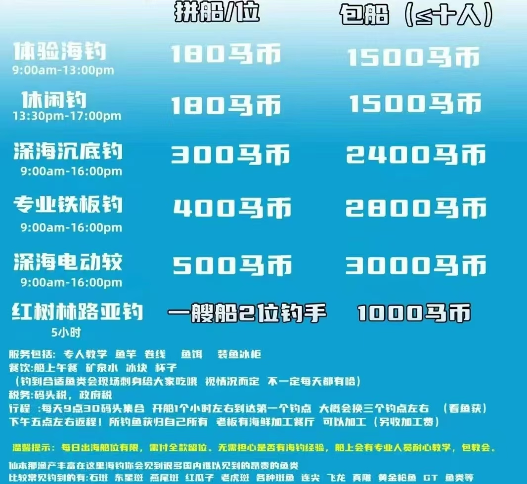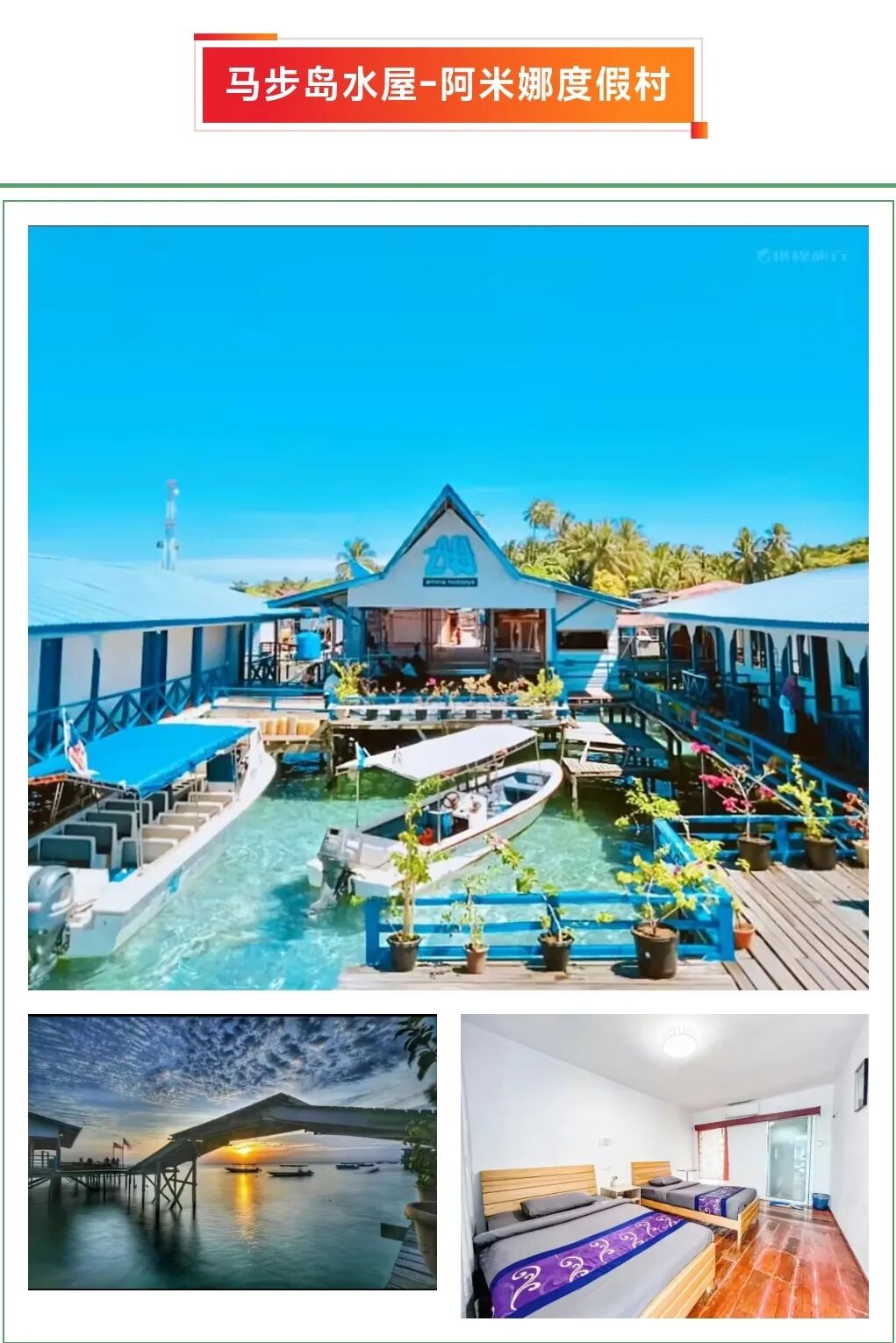 2. 酒店税:马来西亚法定征收旅游税,每晚每间10马币(酒店前台收取)3.用餐: 行程中未包含的用餐,镇上出海晚餐(每餐30-50元不等)6. 自选付费游玩项目(自由选择):无证体验潜水为250马币/人,马步岛高级水屋上岛拍照50马币/人(自选付费项目,具体费用以当地实际汇率为准)