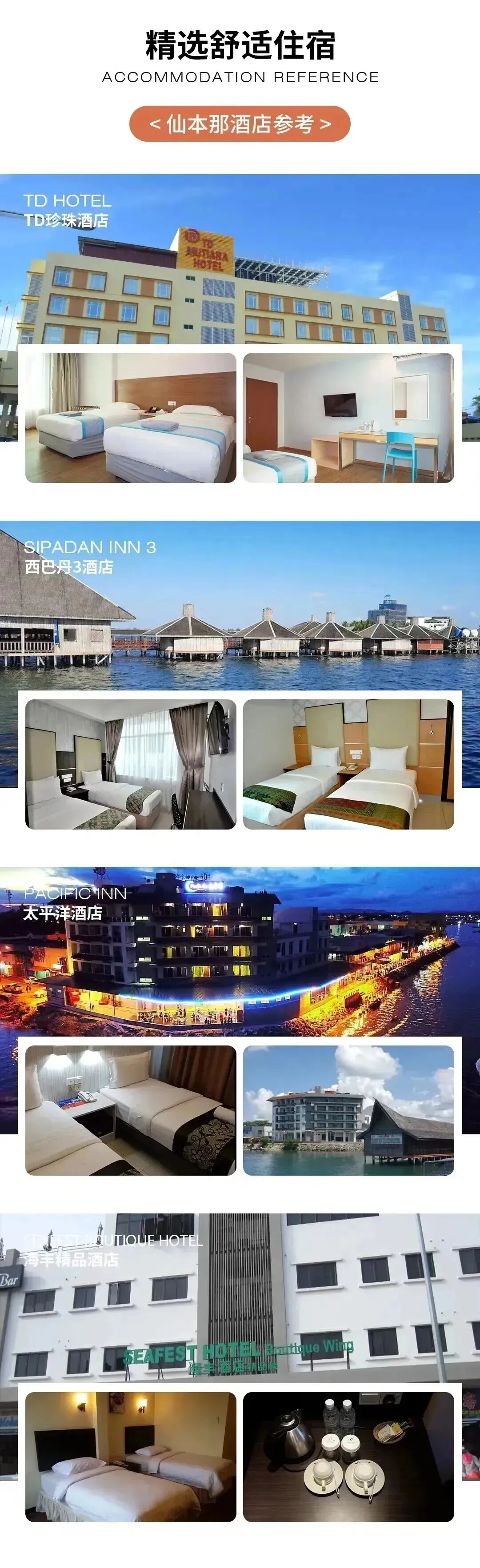 1.住宿:5天住宿, 4晚仙本那(参考酒店:仙本那唐朝或海丰精品或同级)、1晚马步岛水屋(参考水屋:阿米娜)