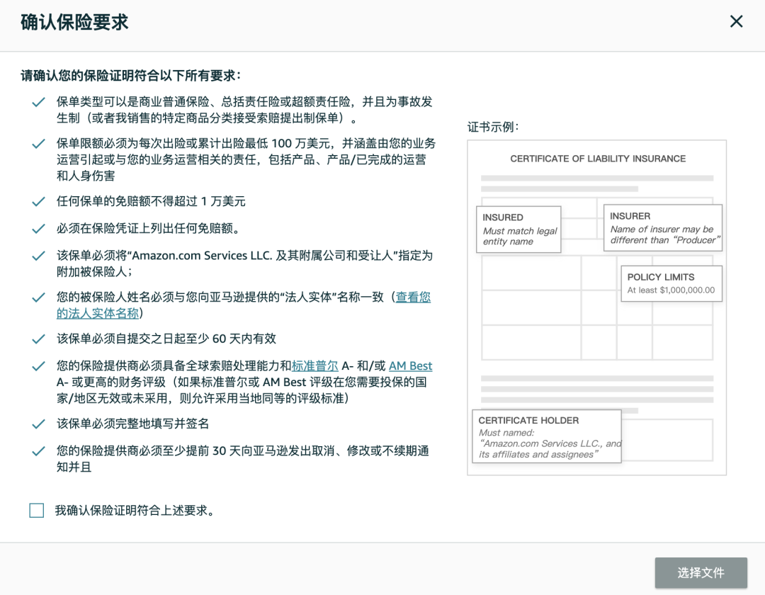 “保险单必须保障您在 Amazon.com 商城上发布的所有商品的销售”这样的要求。