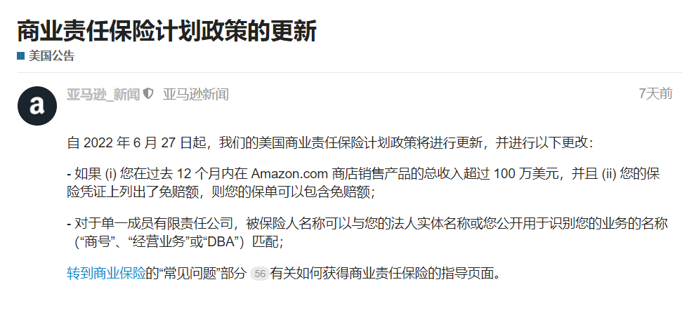 更新后的亚马逊美国商业责任保险计划政策从2022年6月27日起正式生效!!