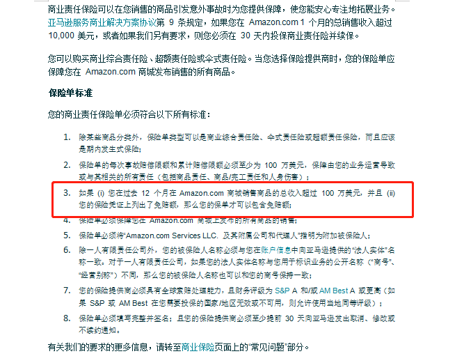 “如果 (i) 您在过去 12 个月在 Amazon.com 商城销售商品的总收入超过 100 万美元,并且 (ii) 您的保险凭证上列出了免赔额,那么您的保单才可以包含免赔额”