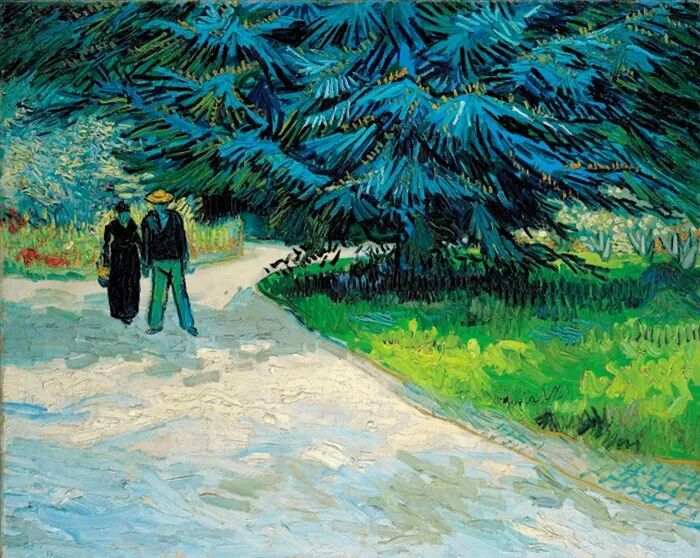 在恋人这一维度,梵高描绘爱情的画作是最能展示他丰富想象力的作品。现实中的梵高是一个在感情路上屡屡受挫的失败追求者,但他的作品则源于对爱情的美好憧憬和从文学诗歌中提取的灵感。他笔下的情侣形象,漫步于月光下或绿荫中,展现出他未曾触及却渴望拥有的理想化爱情。不过,爱情的另一面也在《夹竹桃》中得到了独特展现。梵高将夹竹桃视为“讲述爱情的花”,并在画中特意将埃米尔·左拉(Emile Zola)的《生之欢愉》(La Joie de vivre)放置在桌角。这一安排暗含深意:尽管书名似乎象征着爱情的美好,左拉的小说实际更多讲述爱情的苦恼。梵高用盛开的花朵与讽刺意味的文学文本构建出一种微妙的张力。这种对比仿佛在暗示爱情的复杂性——既是生命力的象征,又是苦涩与幻灭的源头。通过这一布置,梵高以画面语言掲示了爱情的两面性,表现出他对情感本质的洞见。梵高作品中的诗人与恋人,实则是其内心世界的两面化身。