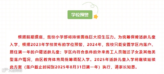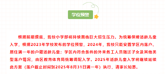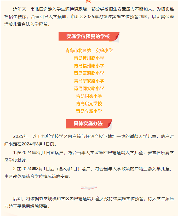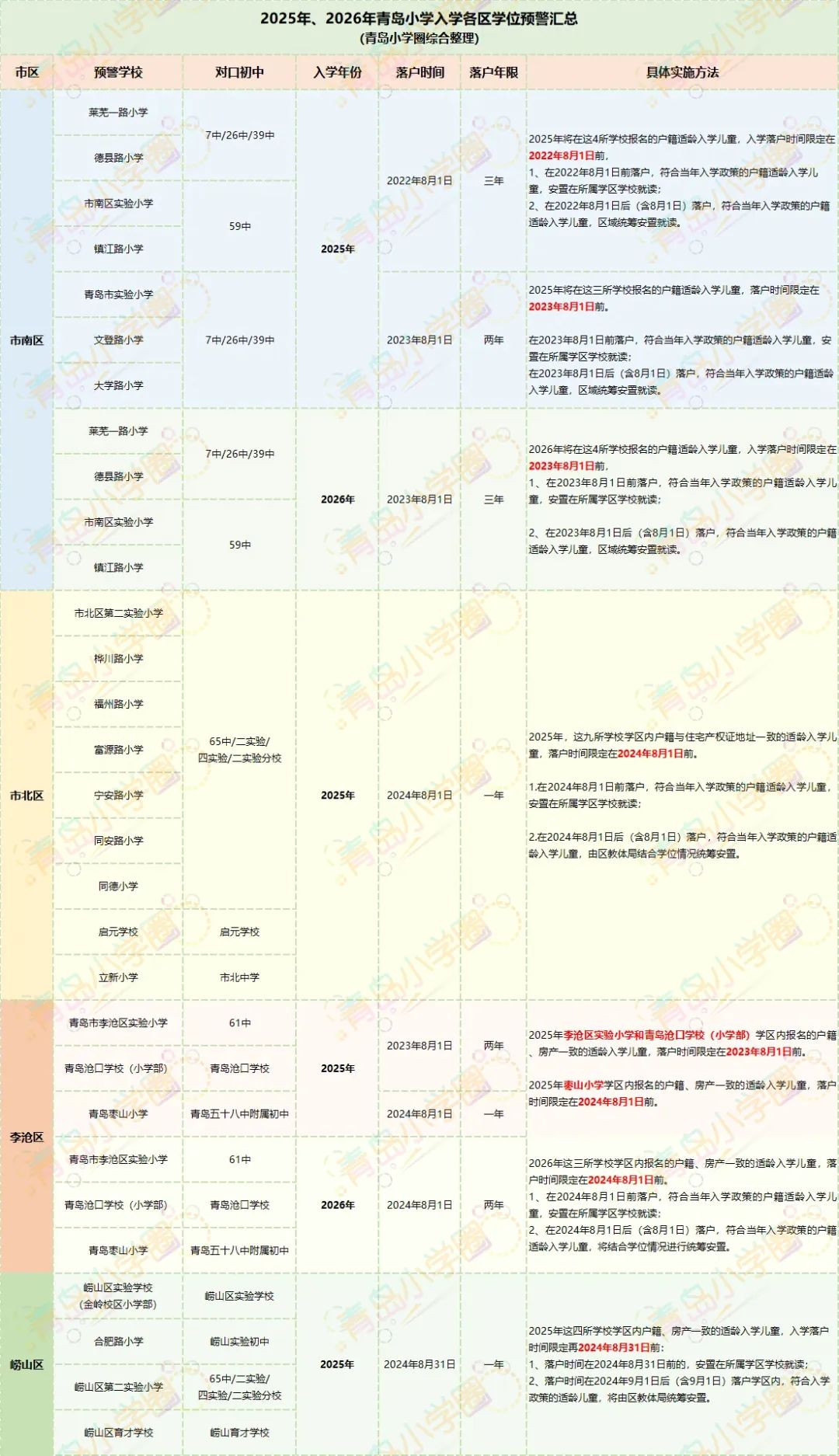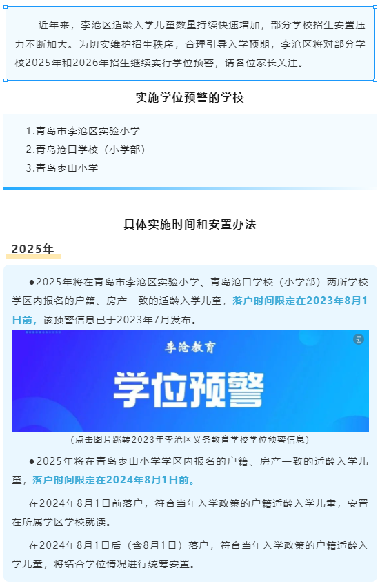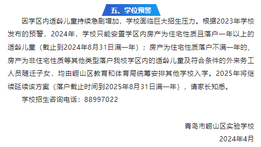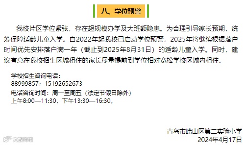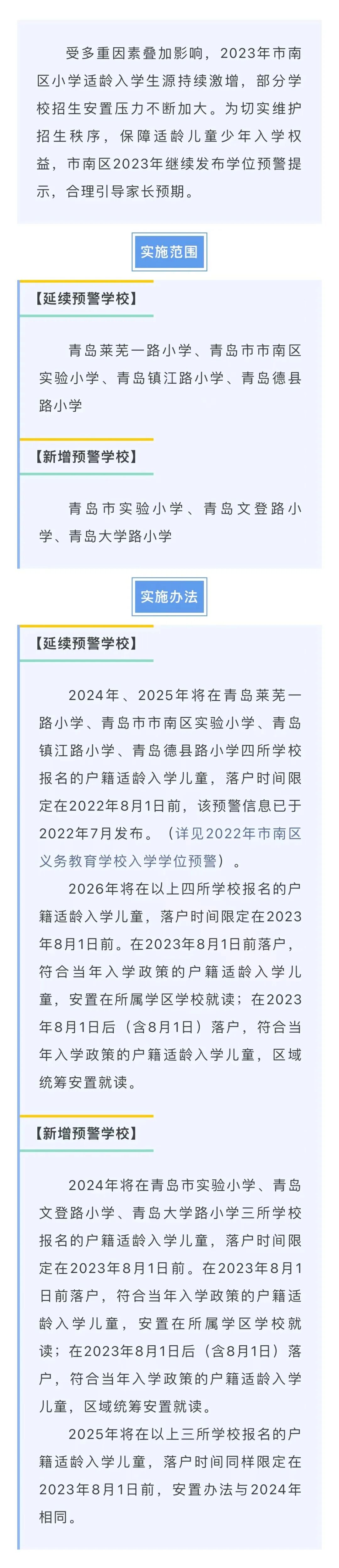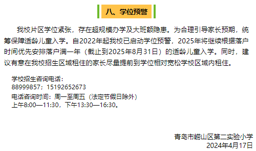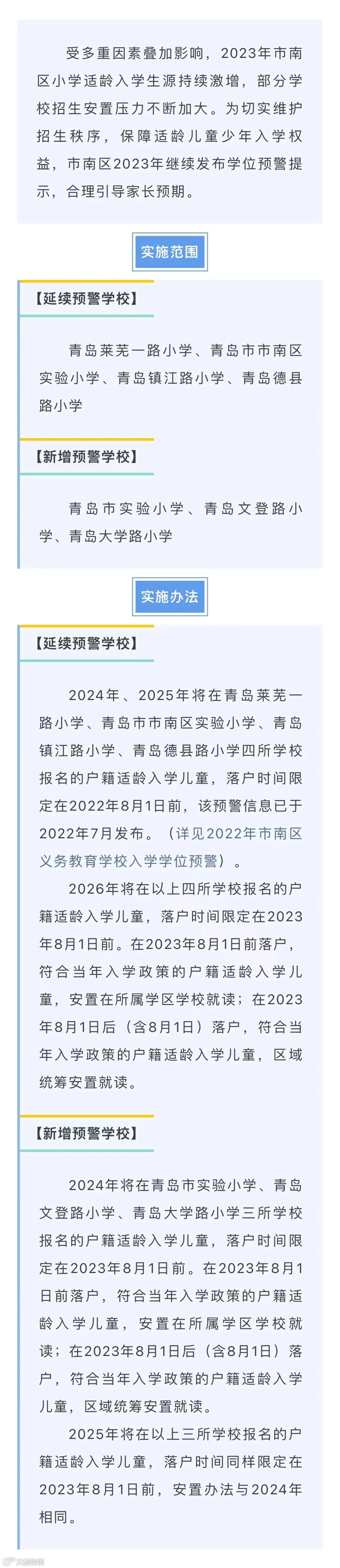 截止到目前,对于2025年小学入学适龄儿童,市南区、市北区、李沧区、崂山区、,共有23所小学发布学位预警说明。即: