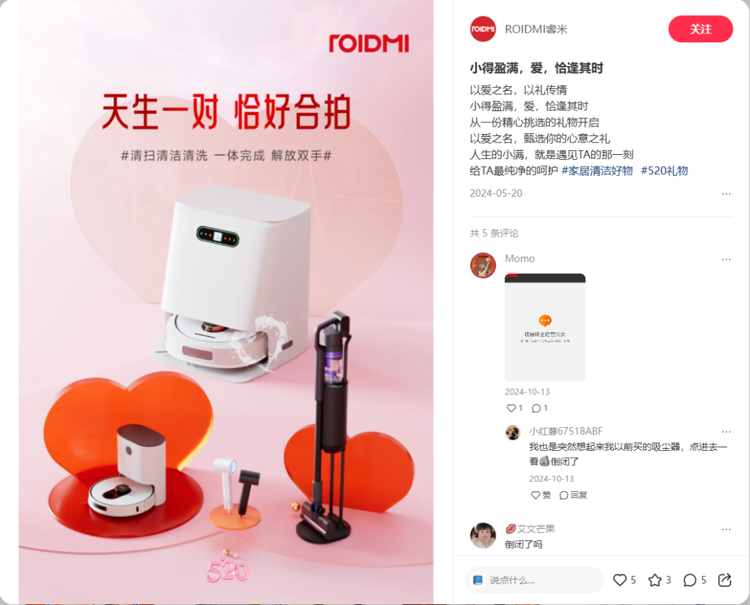 而小红书动态则终止于2024年5月20日,而且从评论区用户反馈截图可以看到,早在2024年10月份时ROIDMI睿米的店铺就已公布终止经营公告,且售后联系无人。
