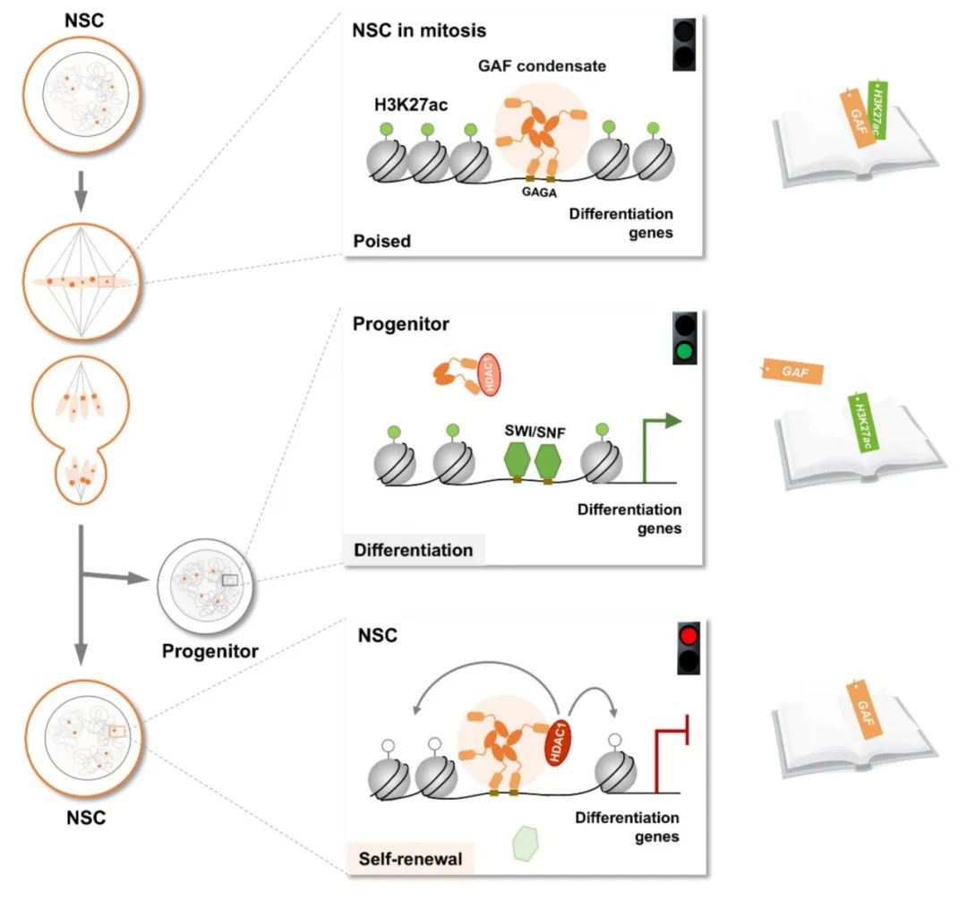 借助实验室新近开发的鉴定发育脑中有丝分裂书签基因组结合位点的BISMIB组学技术 (Shen et al., STAR Protocols, 2025)【9】并结合精细的果蝇分子遗传学、细胞生物学、液-液相分离、生物化学和其它多组学技术,研究人员发现,在果蝇中脑区II 型神经干细胞不对称分裂过程中,关键促分化基因位点被先锋因子GAF(GAGA因子)及组蛋白修饰H3K27ac两个有丝分裂书签“双重标记”。在新生的维持神经干细胞命运的子细胞中,GAF通过组蛋白去乙酰化酶HDAC1介导的H3K27去乙酰化“删除”H3K27ac 书签,及时抑制促分化基因的转录,进而确保神经干细胞自我复制的命运;与之相反,在即将分化为神经祖细胞的子细胞中,GAF在关键促分化基因位点上的结合被染色质重塑复合体SWI/SNF竞争性取代,H3K27ac标记因此得以保留并快速激活促分化基因的表达,进而确保神经祖细胞趋向分化的命运。因此,本研究揭示了一种全新的“拮抗性双重有丝分裂书签标记与选择性分子竞争相结合”的机制,实现细胞命运记忆在姐妹子细胞中的差异性继承。