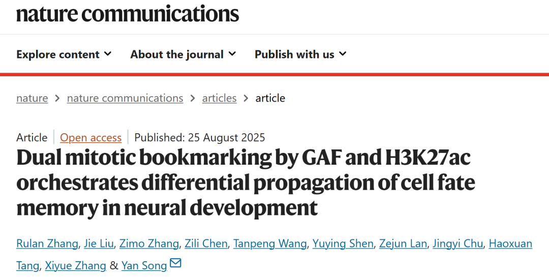 2025年8月25日,北京大学生命科学学院宋艳课题组在Nature Communications上在线发表了题为Dual mitotic bookmarking by GAF and H3K27ac orchestrates differential propagation of cell fate memory in neural development 的最新研究成果【8】。该研究发现神经干细胞在不对称分裂后,其命运记忆在姐妹子细胞中以差异化方式保留或重写。这种细胞命运记忆的差异性传承是通过先锋因子GAF与组蛋白修饰H3K27ac的拮抗性双重有丝分裂书签标记联合SWI/SNF复合体介导的选择性分子竞争共同实现的。