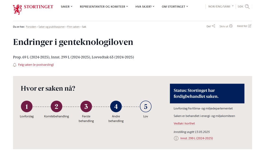 导读:2025年5月26日,挪威议会通过了《基因技术法》的修订案,旨在对部分基因技术产品放松监管以促进创新。