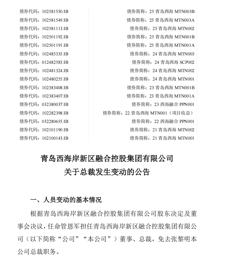 企查查信息显示,近日,青岛西海岸新区融合控股集团有限公司(下称“青岛融合控股集团”)发布关于总裁发生变动的公告,根据青岛融合控股集团股东决定及董事会决议,任命管恩军担任公司董事、总裁,免去张黎明本公司总裁职务。