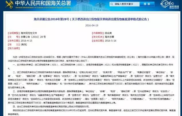 修改后的进出口货物报关单和进出境货物备案清单格式自2016年5月16日起启用,空白的原格式报关单、备案清单作废,但在此之前已打印并经海关签章的原格式报关单、备案清单继续有效。
