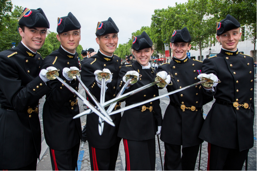 巴黎综合理工学院(别称“X大”)是一所具有军事特色的历史名校,该校每一届学生都被编入独特的“Cohort”(源自罗马时代的步兵营编制)。在正式场合中,研究生们身着军装,服装上醒目的红蓝条纹搭配佩剑在校园里格外引人注目。