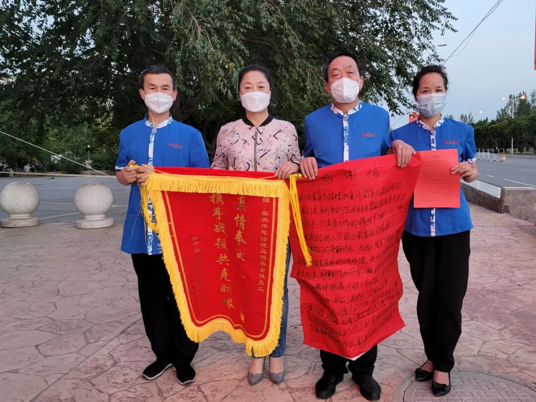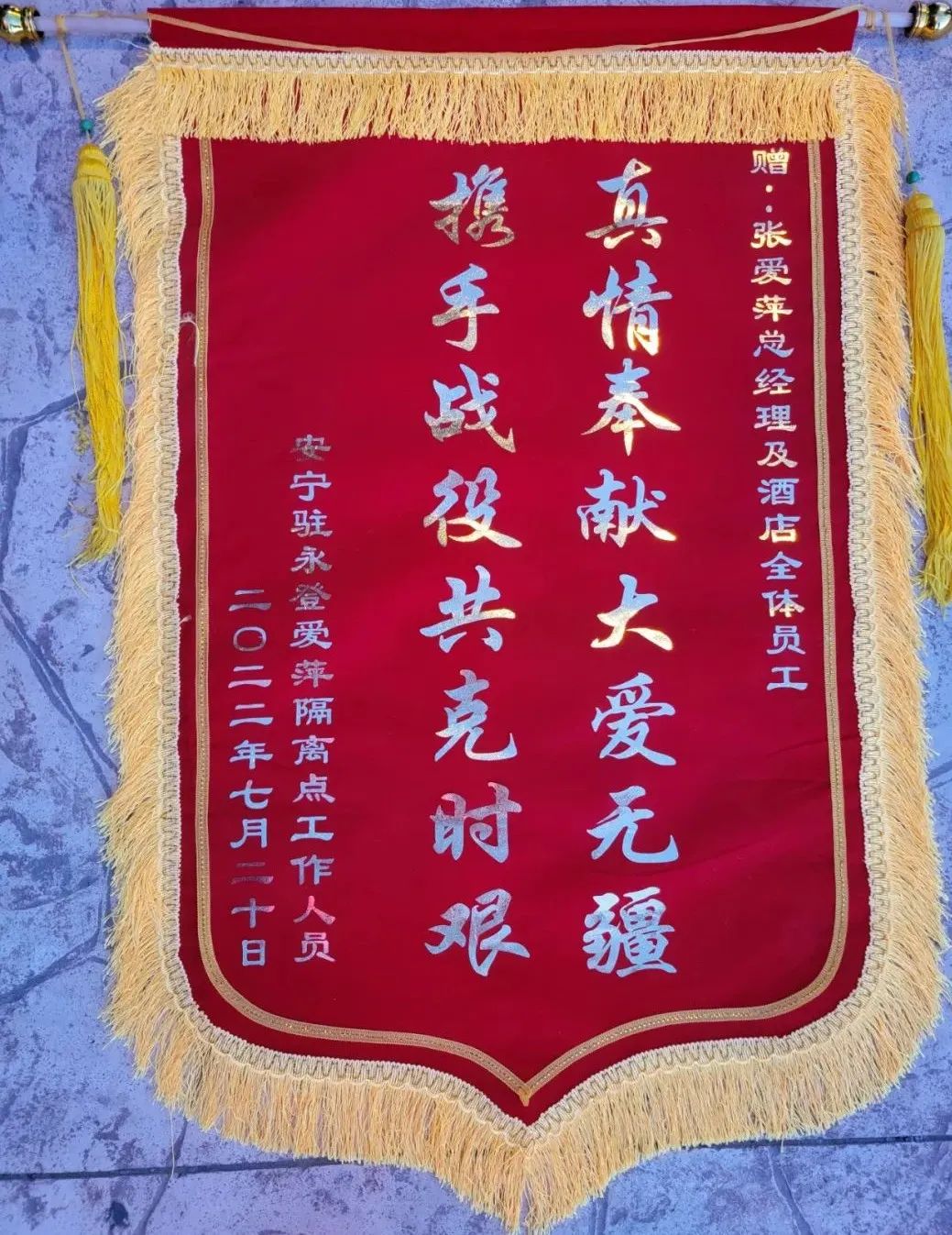临走之时,医护工作人员向金川爱萍大酒店送来感谢信和锦旗,感谢张爱萍总经理及酒店员工给他们营造了舒适温馨而又符合隔离要求的工作环境,提供了精致可口的饭菜,得到了如同家人般的体贴和照顾,使他们顺利完成了隔离监护任务,并称爱萍人为“最佳幕后英雄”。