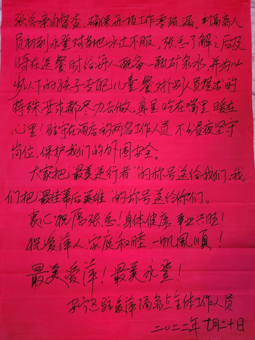 感谢你们用自己辛勤的付出,给我们营造了舒适温馨而又符合隔离要求的工作环境,使我们顺利完成了隔离监护任务。并得到了如同家人般的体贴和照顾,使我们更加精神饱满、干劲十足的投入到工作中。你们就是我们的加油站!是我们的坚强后盾!
