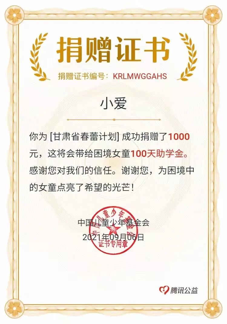 积小善,成大爱,帮助更多春蕾女童继续学业,追逐梦想。“春蕾计划”实施32周年之际,中国儿童少年基金会,甘肃省妇女儿童发展基金会发起了“甘肃贫困女童想上学”公益子计划,借助网络强大优势,让我们大家献出自己的爱心。爱萍捐款1000元,响应这一号召。