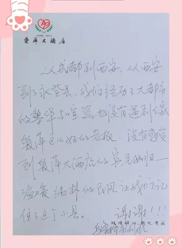 近日,一位从成都去新疆的客人入住爱萍大酒店后,被爱萍大酒店优雅的环境和良好的服务所感动,临走之时,感慨留言。因为爱萍大酒店,客人也记住了永登这座城。真是应了那句话,因为一个人而记住了一座城,今天我们要说,因为爱萍大酒店,客人记住了永登这座城。