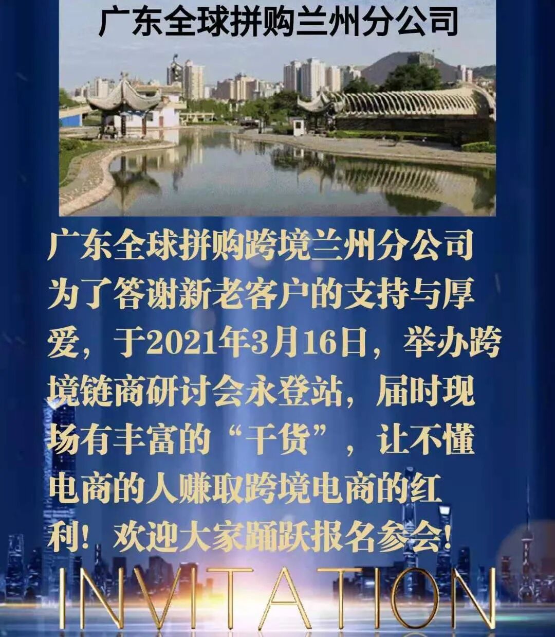 全球拼购为了答谢新老客户的支持与厚爱,于2021年3月16日下午14:30诚邀大家参加全球拼购跨境链商研讨会——永登站!现场全是“干货”,让不懂电商的人在跨境电商赚得盆满钵满!