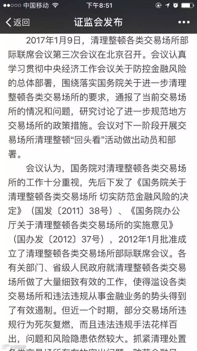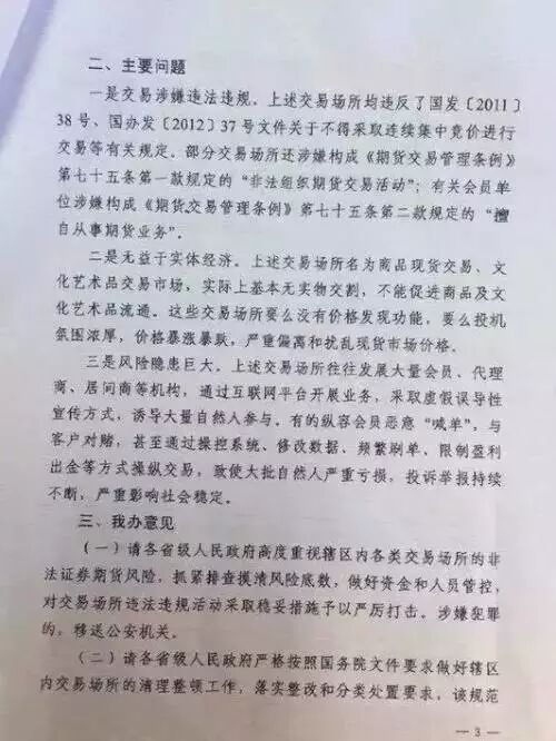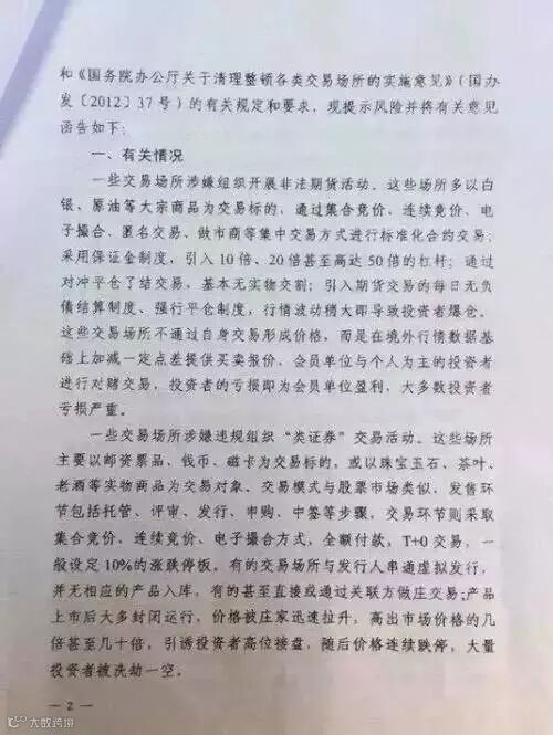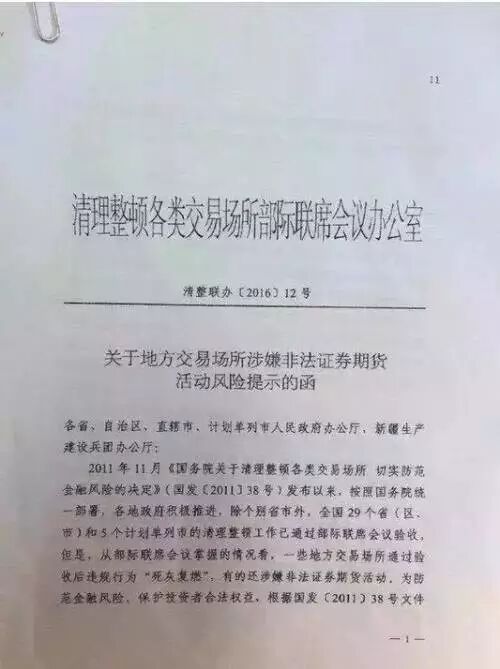 1月10日晚间,据媒体消息,一份由清理整顿各类交易场所部际联席会议办公室在2016年12月16日印发的《关于地方交易场所涉嫌非法证券期货活动风险提示函》(下称风险提示函)从业内流出,进一步加剧了躺着就能暴力赚钱又有后台撑腰的商品现货交易平台的恐慌程度。