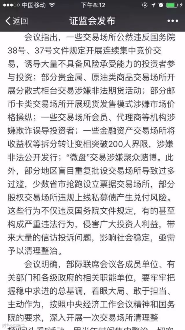 会议指出,一些交易场所公然违反国务院38号、37号文件规定开展连续集中竞价交易,诱导大量不具备风险承受能力的投资者参与投资;部分贵金属、原油类商品交易场所开展分散式柜台交易涉嫌非法期货活动;部分邮币卡类交易场所开展现货发售模式涉嫌市场价格操纵;一些交易场所会员、代理商等机构涉嫌欺诈误导投资者;一些金融资产交易场所将收益权等拆分转让变相突破200人界限,涉嫌非法公开发行;“微盘”交易涉嫌聚众赌博。此外,部分地区盲目重复批设交易场所导致过多过滥,少数省市抢跑设立票据交易场所,部分股权交易场所违规上线私募债产生兑付风险。这些行为不仅违反国务院文件规定,有的甚至构成严重违法行为,侵害广大投资人利益,带来大量的信访投诉问题,影响社会稳定,亟需予以清理整治。