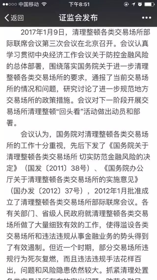 2017年1月9日,清理整顿各类交易场所部际联席会议第三次会议在北京召开。会议认真学习贯彻中央经济工作会议关于防控金融风险的总体部署,围绕落实国务院关于进一步清理整顿各类交易场所的要求,通报了当前交易场所的情况和问题,研究讨论了进一步规范地方交易场所的政策措施。会议对下一阶段开展交易场所清理整顿“回头看”活动做出动员和部署。