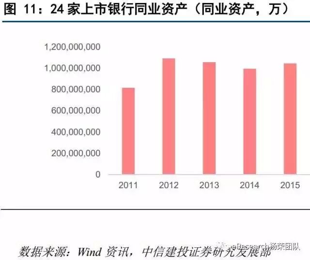 我们可以明显看到,以存放同业,拆出资金以及买入返售三项加总后的同业业务规模在2013年“去杠杆”为核心的货币政策后,规模开始转向。而2014年相关政策出台后,同业业务进一步下滑。虽然2015年有所上升,同比增速大致为5%,仍然属于正常范围。