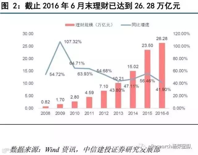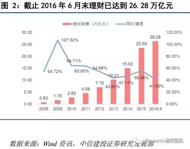 到2016年6月底,银行理财余额为26.28万亿元,较年初增加2.78亿元,增长率为11.83%。而2014年,2015年的全年增速分别为47.11%,56.46%,增速高但也有所放缓。