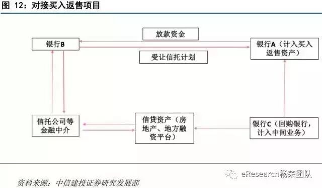 127号文之前主要模式:银行A通过通道银行B向信托公司等金融中介融出资金,信托公司等金融中介拿到资金后再将资金贷给如房地产企业、地方融资平台等特定融资需求方。根据监管的规定,通道银行B不能直接对出售给银行A的信托计划或信托受益权提供担保回购,而需由另外一家银行C 提供远期回购承诺。在这个系统当中,银行A获得的信托受益权属于同业业务,在银行A的资产负债表当中体现为买入返售金融资产,不属于贷款,因此不影响银行贷款额度和存贷比,也不受国家宏观调控对贷款的限制,同时银行A不直接承担贷款风险,而由提供担保的回购银行C直接承担贷款风险。贷款风险的主要承担方银行C,其从事该项业务的收入计入中间业务收入。