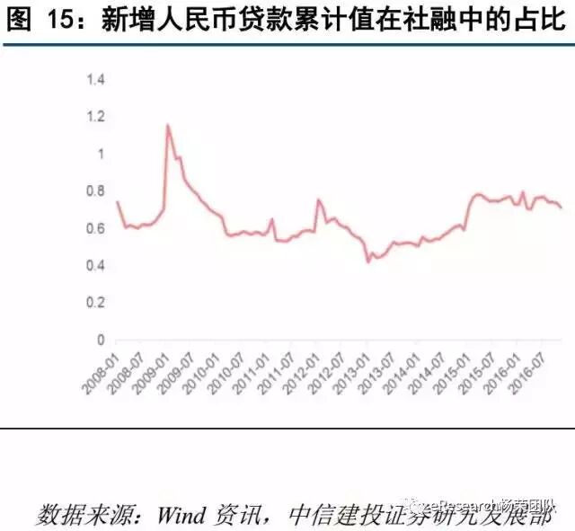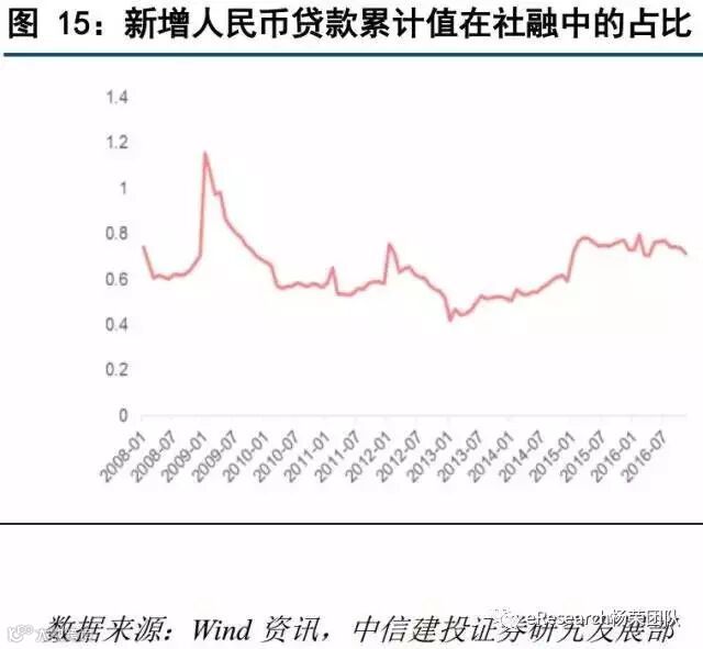 9、毫无疑问,银行资金空转的压缩将减少银行相对高收益资产的获取,在短期一定会对银行利润造成一定的负面影响。在2017年理财空转模式受到最大影响的预测下,由于城商行以及农商行理财规模扩张速度远高于国有商业银行以及股份制商业银行,城商行,农商行的收益将相对受到更大的影响。在广义信贷上限一定的情况下,既然空转模式得到限制,银行将改变资金配置方向。因为一般性贷款收益更高,在不考虑贷款需求的情况下,我们认为银行有激励将资产配置于一般性贷款。新增人民币贷款的累计值在社融累积值中的占比已经有所回升,未来我们认为也会保持这发展趋势。一般性贷款占比提升将减少银行的风险。一般性贷款收益作用较慢,但从长期来看,必定会抵消空转业务对收益的不良影响,整体提升银行业绩。