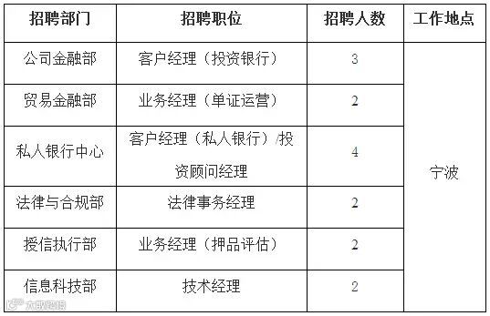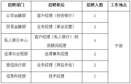 根据业务发展需要,中国银行股份有限公司宁波市分行(以下简称“中国银行宁波市分行或我行”)部分职位现面向社会公开招聘。现就有关招聘事宜公告如下: