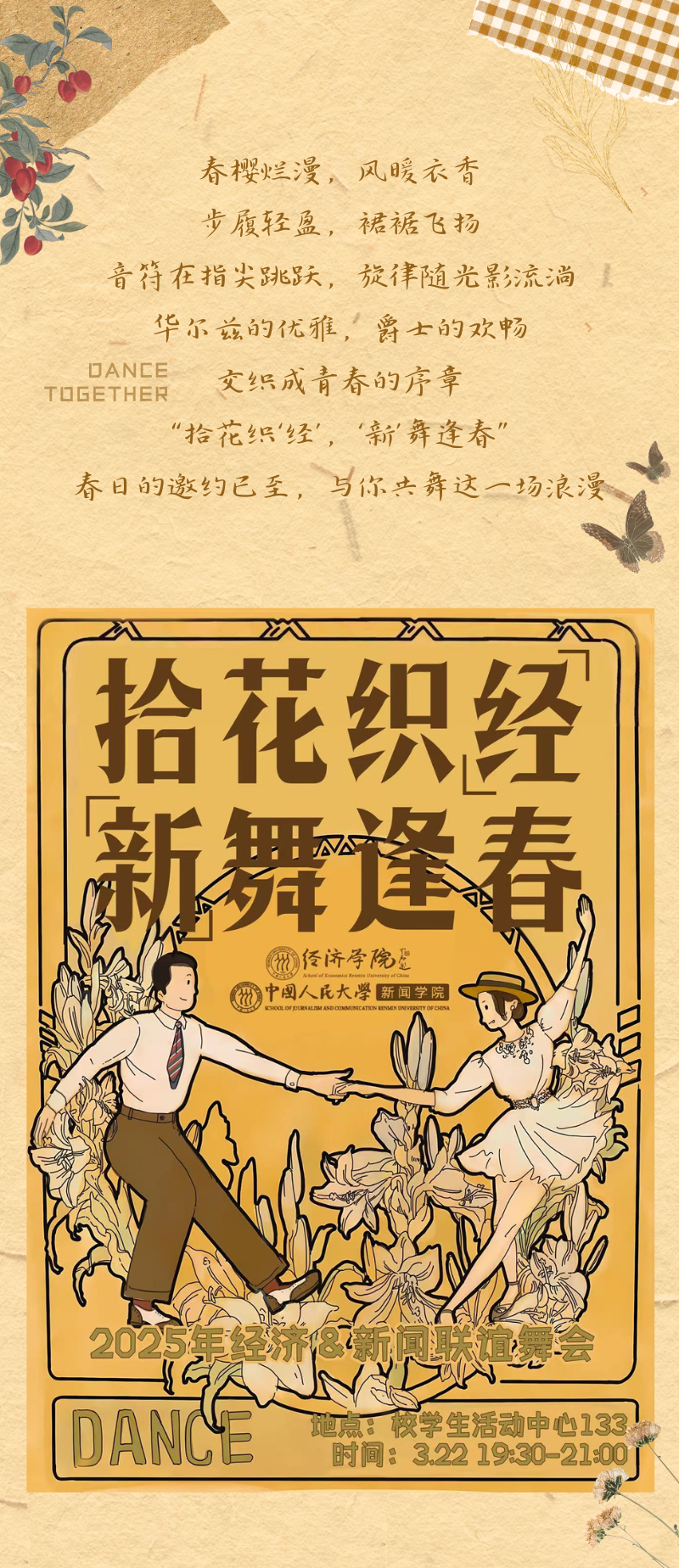 同学们可自行邀请心仪舞伴(欢迎携其他学院的舞伴一同参与),也可选择由工作人员进行匹配。我们将提供统一舞蹈教学指导,无论您与舞伴是否有舞蹈基础,都能轻松享受舞会乐趣。