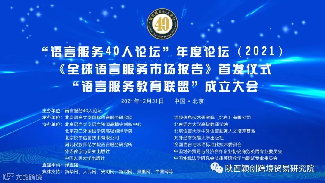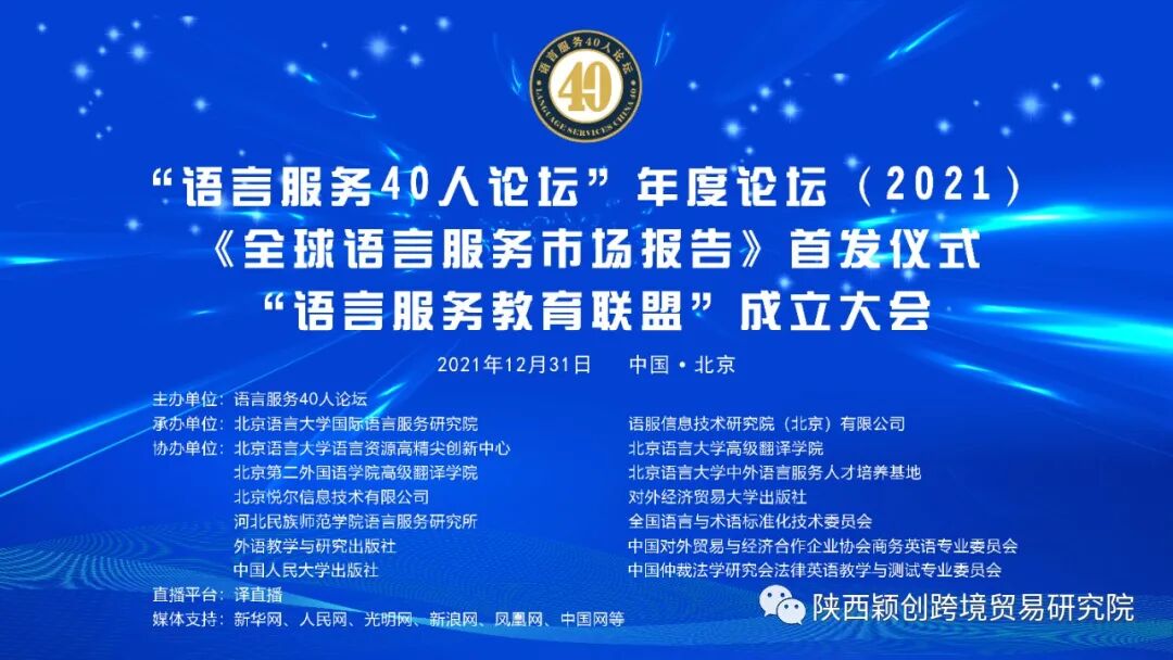 由中国语言服务四十人论坛组织发起的语言服务教育联盟成立大会于2021年最后一天在云端举行,北京大学、对外经济贸易大学、北京语言大学、北京第二外国语学院、河北民族师范学院、西安翻译学院、外研社、中国人民大学出版社、对外经济贸易大学出版社、中国仲裁法学研究会、陕西颖创跨境贸易研究院、北京悦尔信息技术有限公司等全国数十所高校、三家出版社、一个行业协会、二所研究机构、二家国内外语言服务企业线上参与了盛会。