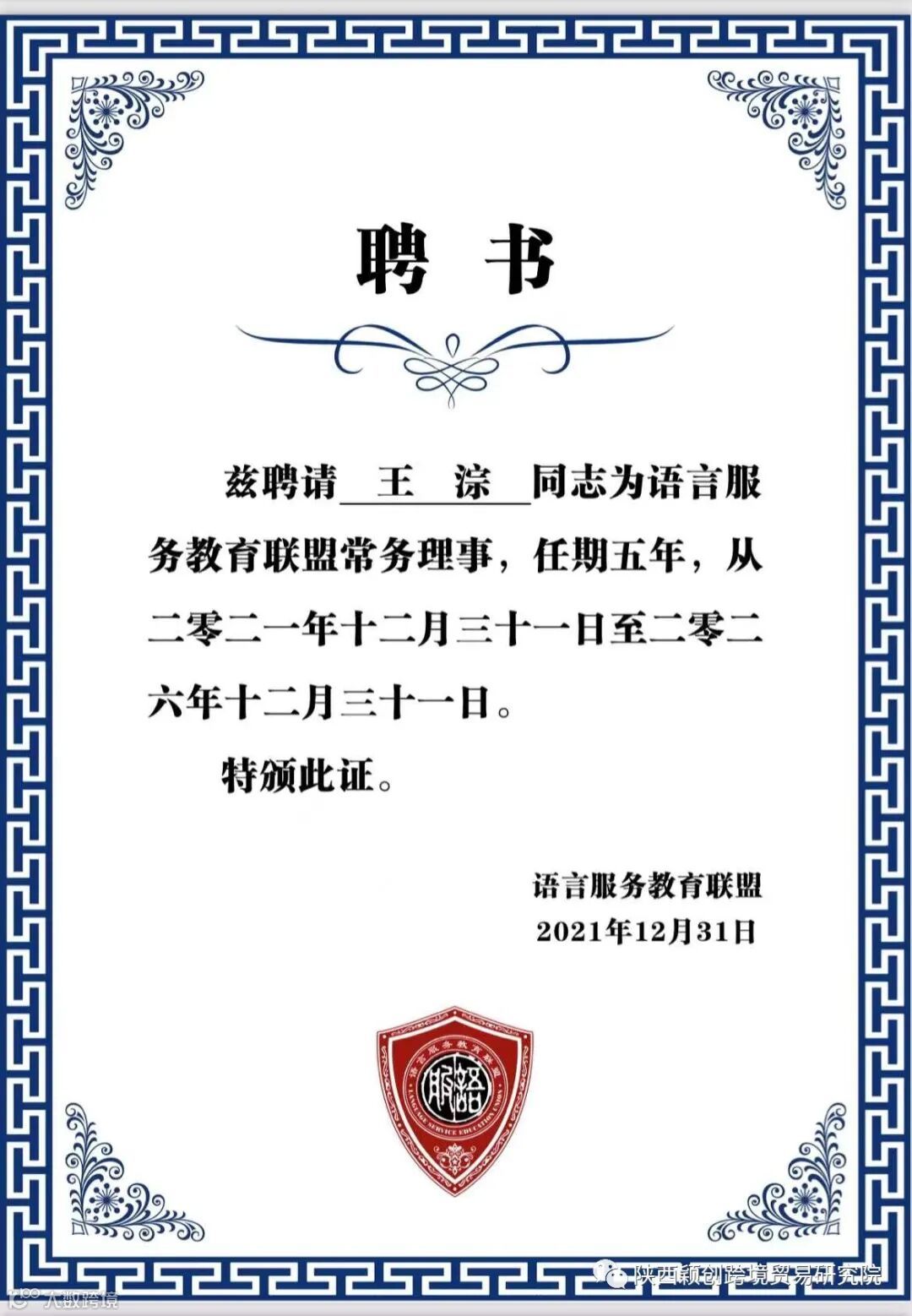陕西颖创跨境贸易研究院王淙院长获聘为该联盟常务理事。这是对王淙院长坚持30余年语言服务教育和语言服务研究的肯定,也是对陕西颖创跨境贸易研究院积极开展跨境贸易语言服务和跨境语言服务研究的充分肯定。