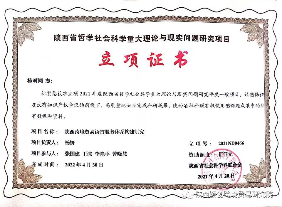 近日,从陕西省社科联传来消息,我院杨妍同志主持的《陕西跨境贸易语言服务体系构建》课题获得2021年度陕西省哲学社会科学重大理论与现实问题研究项目立项。