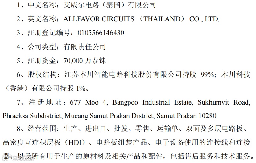 2025年1月9日,江苏本川智能电路科技股份有限公司(以下简称“本川智能”)发布公告称,截至目前,泰国子公司已收到泰国投资促进委员会(BOI)下发的批准通知书,为顺利推进泰国子公司的建设,公司及全资子公司本川科技(香港)有限公司按照其持股比例已完成以自有资金向泰国子公司的增资。本次增资完成后泰国子公司的注册资本由3亿泰铢增加至7亿泰铢。