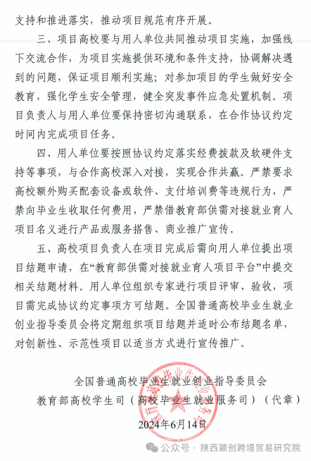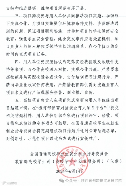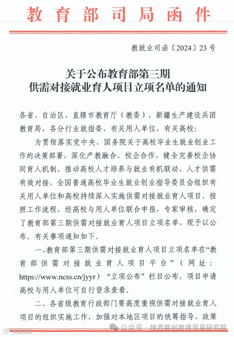 此次三项教育部就业育人项目的成功立项,标志着陕西颖创跨境贸易研究院在促进高校“双一流”专和人才培养方面取得了新的重要突破。研究院将继续深化产学研融合,加强与在陕高校合作,为培养更多具有创新精神和实践能力的自贸区建设人才而不懈努力。