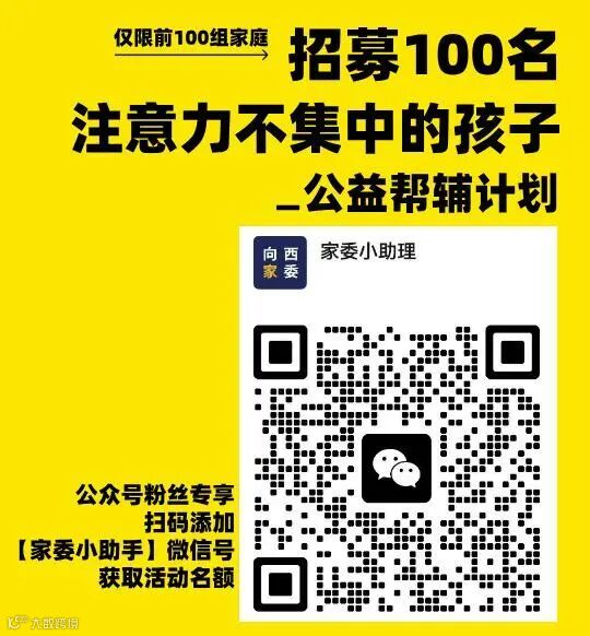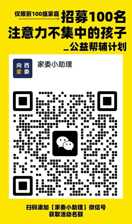 为了帮助更多在学习上遇到注意力困难的孩子,向西家委会公众号推出【注意力不集中“公益帮辅”计划】,为前100名家长提供帮助。
