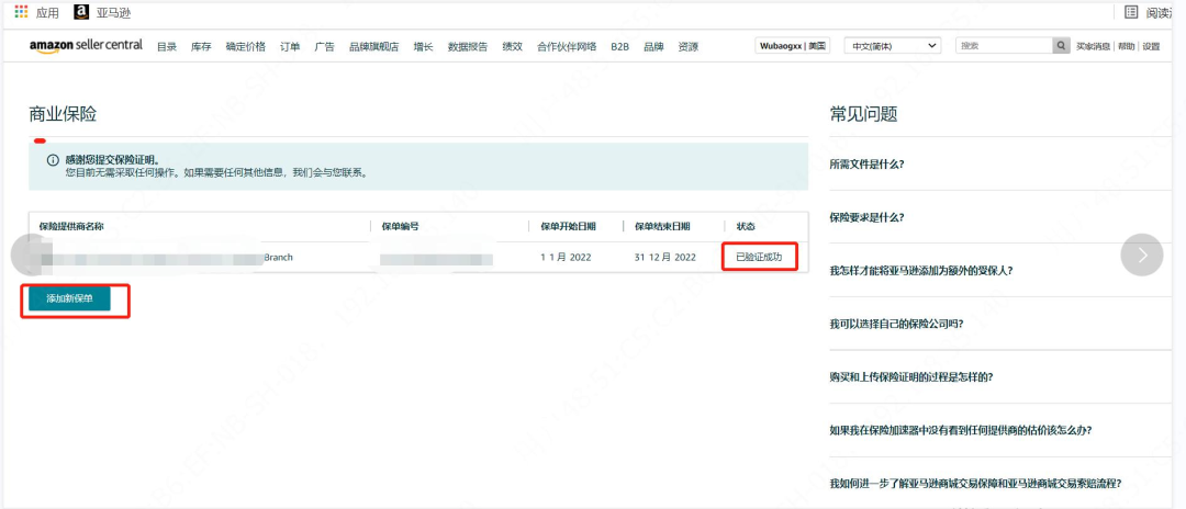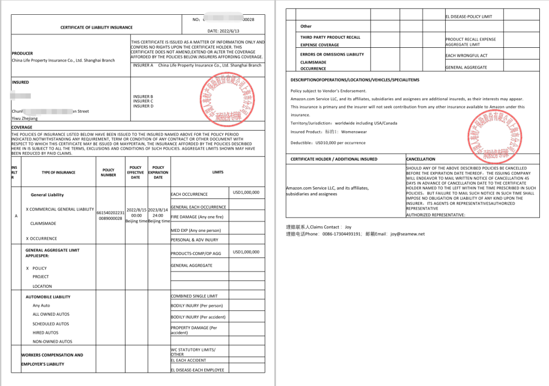 亚马逊要求商业综合保险必须要添加“Amazon.com Services LLC.及其附属公司和受让人”(地址为“P.O.Box 81226, Seattle, WA 98108-1226.”)为附加被保险人,否则将会审核不通过。