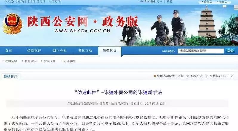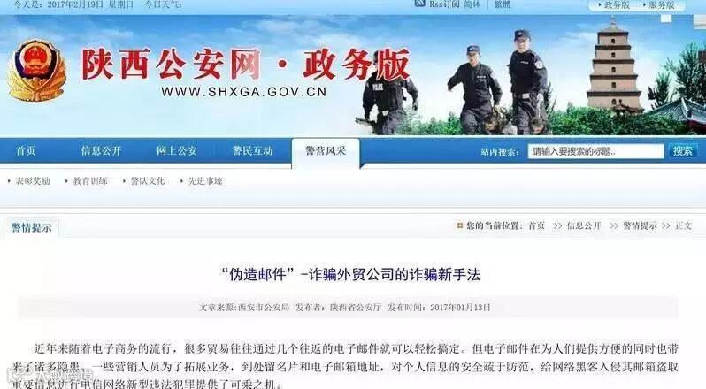 【导读】日前,据陕西省公安厅报道,近期西安市就接连发生两起利用冒充客户电子邮件进行交易的新型电信网络犯罪案件,嫌疑人利用外贸企业以邮件方式进行业务洽谈和资金交易的漏洞,发送虚假汇款账号,冒充正规交易对端,致使外贸企业“中招”,损失严重。