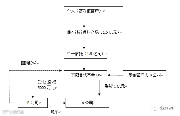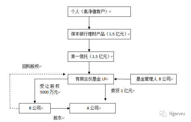 在增值税的分析中,我们经常会刻意的区分最终的投资者以及资管产品,其实资管产品在投资下一个资管产品或者直接投资由企业发行人发行的股票、债券、优先股、应收票据、应收账款、信贷资产收益权、有限合伙基金LP份额等金融商品时,资管产品相对于下一个资管产品或由企业发行人发行的股票、债券、优先股、应收票据、应收账款、信贷资产收益权、有限合伙基金LP份额等金融商品时,就已经处于投资者的身份了。当处于投资者身份时,就需要分析投资的下层资产是否属于以上四种增值税的增税税目,若属于,就应该缴纳增值税,若都不属于,就无需缴纳增值税。例如:个人购买保本的银行理财(银行在理财合同中约定到期会返还本金),银行理财通过单一信托购买了有限合伙基金的LP份额,有限合伙基金通过银行委贷向A公司发放了贷款,同时,有限合伙基金受让了A公司股东B公司持有的对A公司的股权,并约定到期由A公司的股东B公司回购股权。交易结构图如下: