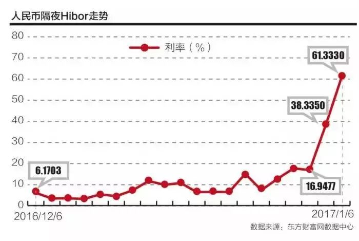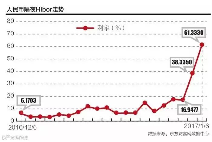 具体来看,人民币隔夜Hibor自2016年10月以来都保持着相对稳定,在12月开始出现上下10个bp范围的波动,12月利率超10%的仅有4天。在2017年1月3日出现17.76%的阶段性高点之后,又在1月5日跳涨至38.34%,并在1月6日继续飙升至61.33%。