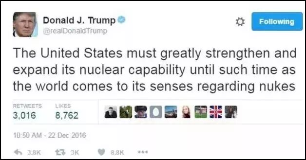 △去年12月22日,已确认当选的特朗普在推特上发文:“美国必须大幅加强扩张自身的核力量。”