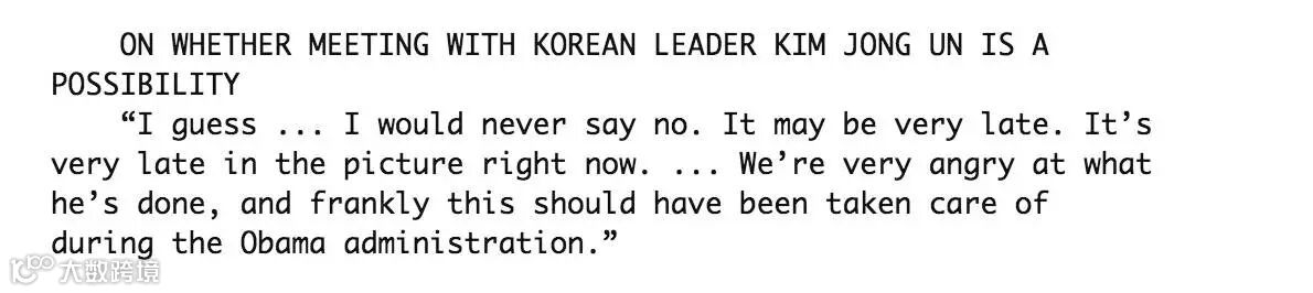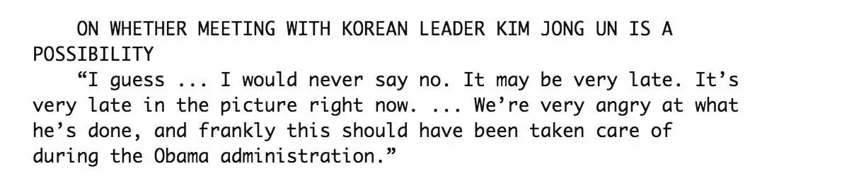 特朗普:呃……我从来没说过不会见。但可能会相当晚,起码从现在看会相当晚……我们对于他(金正恩)的所作所为非常生气,坦白说,这些事情在奥巴马政府时期就应该被小心处理。