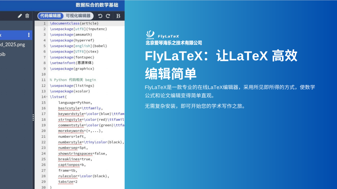 FlyLaTeX是一款功能强大的在线LaTeX编辑器,无需繁琐安装,只需打开浏览器即可开始高效学术写作。无论是处理复杂的数学公式、撰写跨语言论文,还是云端协作或者寻找标准化模板,FlyLaTeX都能提供高效、便捷的解决方案。