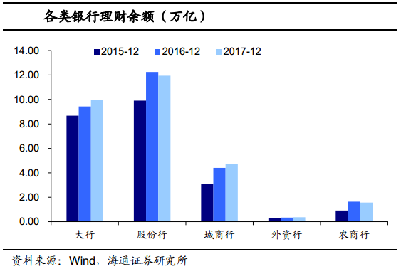 大行渠道优势明显,股份行扩张放缓。股份行的理财规模是过去几年中扩张最快的,相比大行来说,股份行表内负债端压力更大,通过同业理财等渠道,可以大肆扩充表外负债规模,增加收益。但在金融去杠杆的大背景下,同业理财规模大降,个人理财产品将是未来发展的主流;同时资管新规落地之后,理财将逐渐转向净值型,核心竞争力是主动管理能力。而大行无论是在零售渠道,还是投研能力都有一定优势,因此规模也出现上升。