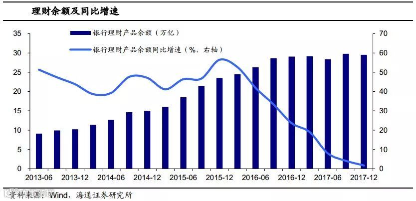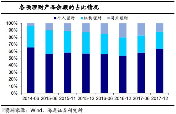 17年内理财规模先降后增,反映监管趋势。进一步的,17年内理财规模整体呈现先降后增,其中17年6月规模下降到28.38万亿,下半年则小幅反弹至29.54万亿。一方面是17年上半年监管较严,尤其是“三三四”检查等相关政策,都直指银行的表外和同业业务,导致理财收缩明显。另一方面是资管新规迟迟没有落地,银行也不敢贸然新增理财规模。下半年监管进入相对平稳期,资管新规的征求意见稿也于11月公布,理财规模则出现小幅反弹。