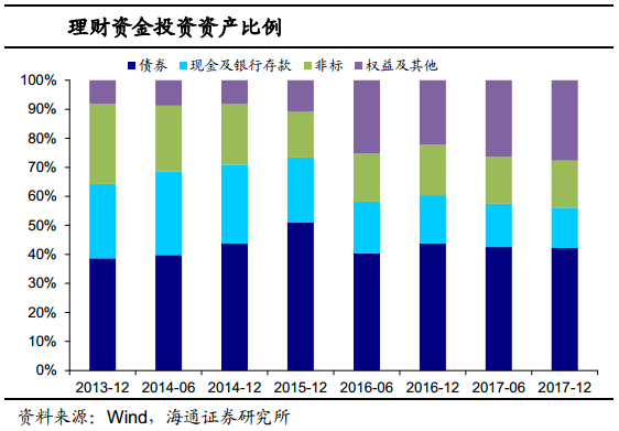 债券、非标、存款配置占比均下滑。资产配置方面,截至17年底,理财配置债券12.46万亿元、占比42.19%,相比16年末分别下滑2500亿和1.57个百分点。其中利率债占比8.1%,较16年末的8.7%下降0.6个百分点,信用债占比34.1%,相比16年末的35.1%下降1个百分点左右。而现金和银行存款、非标的配置比例分别为13.91%和16.22%,相比16年末分别下滑2.71和1.27个百分点。