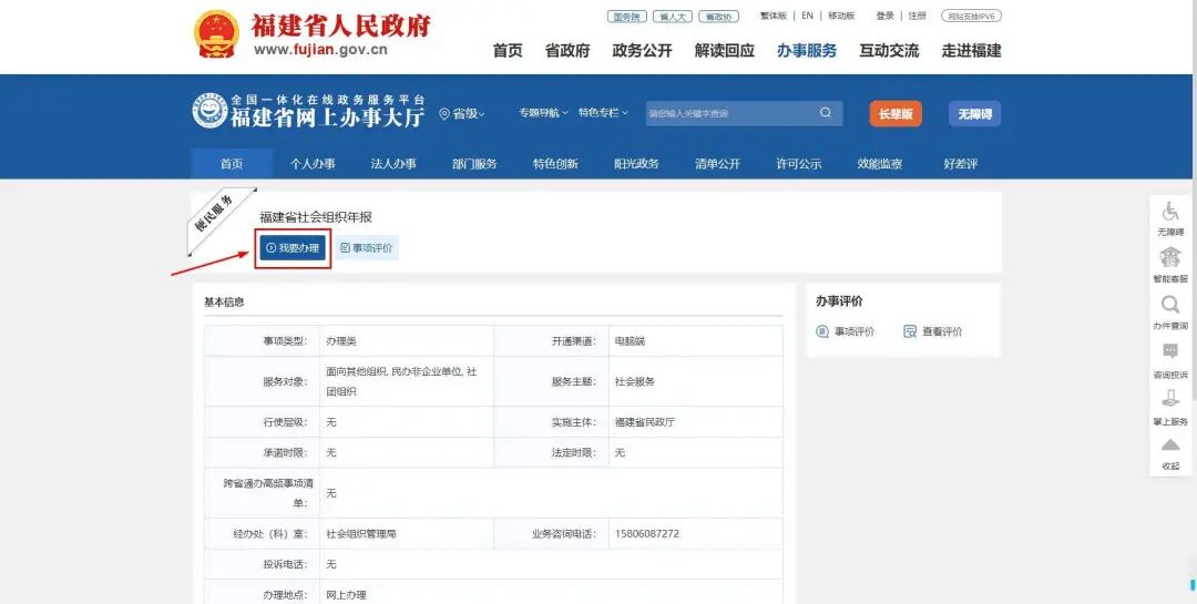 2.第二步:进入填报页面。注册法人账户成功后按照以下流程操作:点击进入“福建网上办事大厅”首页→“我要办”→“部门服务”→“省民政厅”→“便民服务类”,选择“福建省社会组织年报”→“办事指南”(办事指南链接:https://zwfw.fujian.gov.cn/bmGuide?unid=AF9CFA865D5E46F0A13A85FCE08C8506)→“我要办理”进入当年年报填报页面。