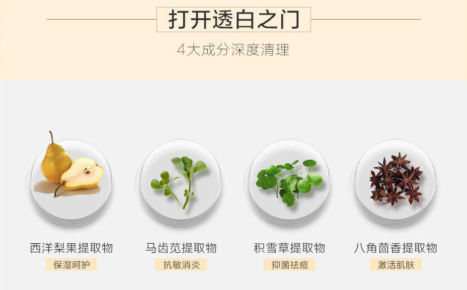 ❶西洋梨果提取物 ,帮助我们解决一般洗面奶洗完以后会有紧绷感的问题,能产生丰富的泡沫,更细致地去呵护到肌肤;